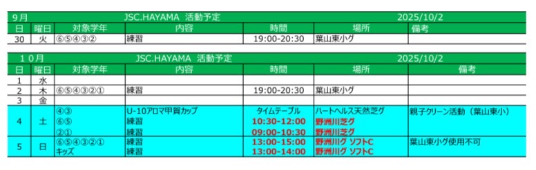 10/4(土)5(日)の練習について 2025 10/02 お知らせ 2025年10月2日 急きょ、監督が一週間不在なためご迷惑をおかけします。下記の通り、練習時間等の変更を行います。お間違え無きようよろしくお願いします。 お知らせ この記事が気に入ったら フォローしてね! Follow Me よかったらシェアしてね! URLをコピーしました! URLをコピーしました! [HAYAMA SAAAAN!!] 今週29weekの活動予定 [HAYAMAさ~~ん!!] 今日10/4satあいにくの雨! 関連記事 [ハヤマさ~~ん!!] 10/6weekの活動予定でぇぇぇす♪ 2025年10月6日 速報!! 練習会場変更について⚽ 2025年10月5日 [HAYAMAさ~~ん!!] 今日10/4satあいにくの雨! 2025年10月4日 [HAYAMA SAAAAN!!] 今週29weekの活動予定 2025年9月30日 「HAYAMA SAAAAN!!」27日satの活動報告⚽ 2025年9月27日 「HAYAMA SAAAAN!!」 ホームページ改定のお知らせ📣 2025年9月26日 「HAYAMA SAAAAN!!」 9/22weekのお知らせですぅぅ 2025年9月24日 大至急💦今日21日の練習会場について 2025年9月21日