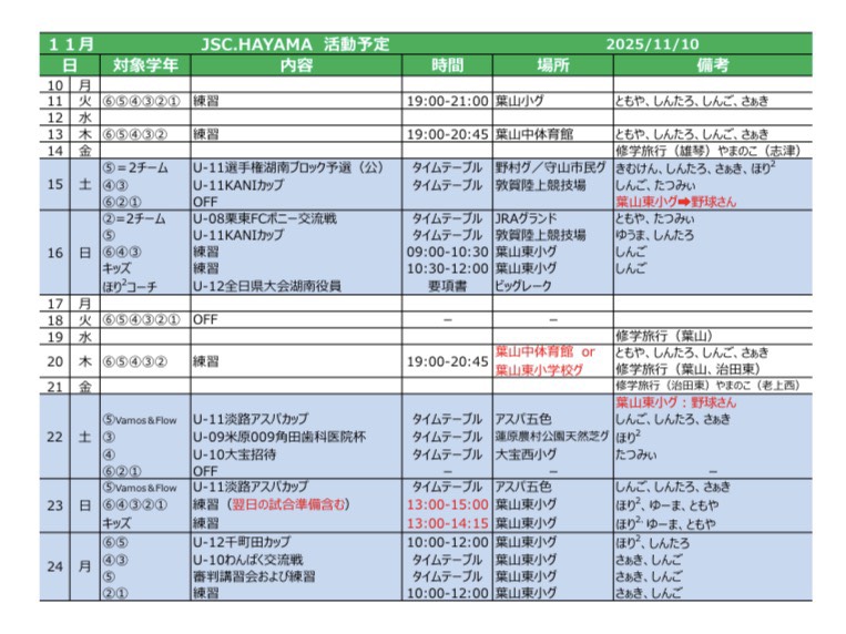 何度でも納得されるまでご遠慮なく該当される学年の練習日をご確認いただいて