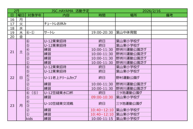 直接、お子様の該当する学年の練習日をお手数ですがご確認いただき