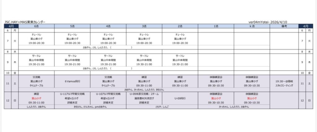 今週のハヤマさんの蹴活予定表で